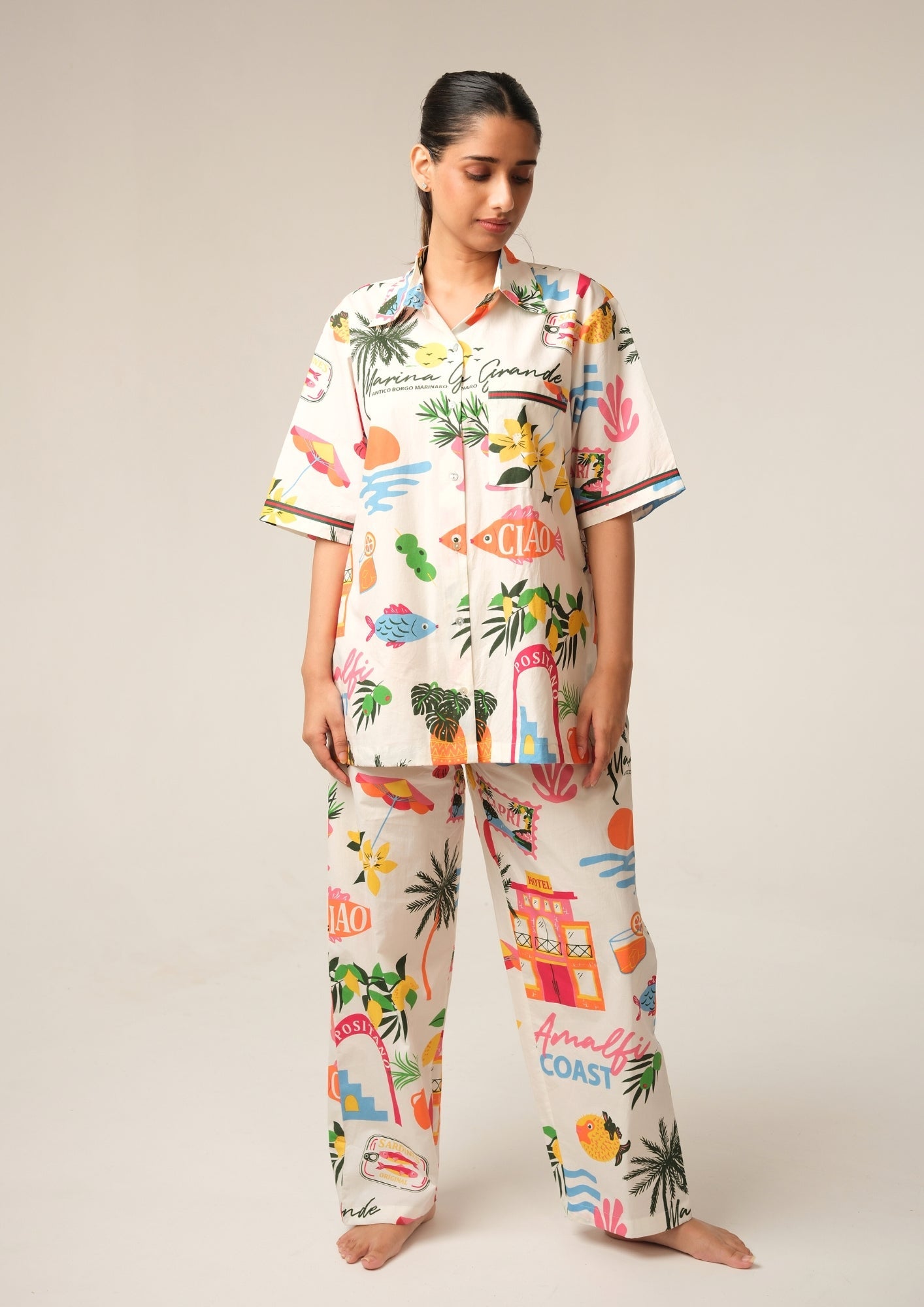 Bring holiday vibes to your evenings with the Amalfi Dreams Printed Night Suit ? a cheerful blend of comfort, color, and coastal charm. Inspired by the vibrant motifs of the Amalfi Coast, this playful set combines easy elegance with relaxed comfort, making it perfect for lounging, gifting, or unwinding in style.