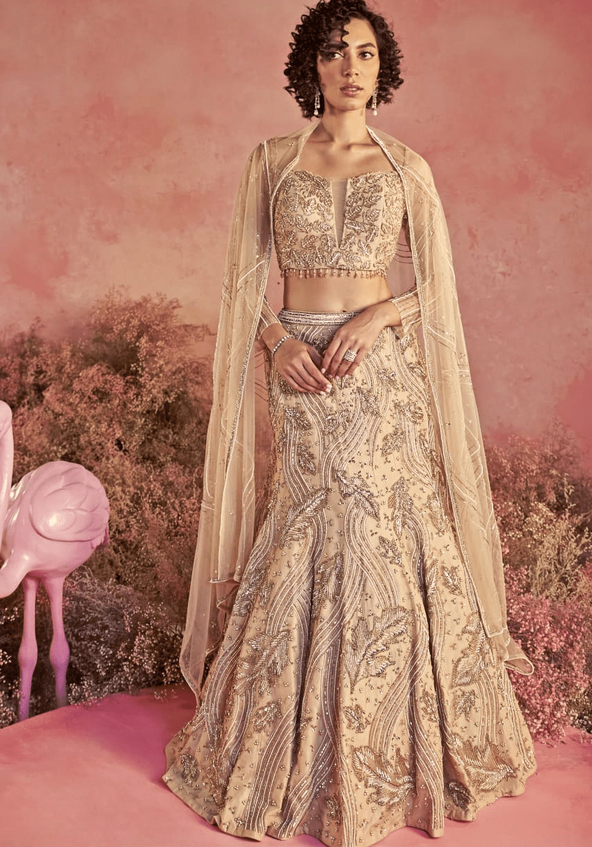 Featuring a captivating mesh mermaid lehenga adorned with meticulous hand-embroidered motifs. Paired gracefully with a matching mesh blouse and dupatta. Elevate your look by accentuating it with statement dangler earrings and heels, ensuring you radiate elegance at weddings or engagement ceremonies.