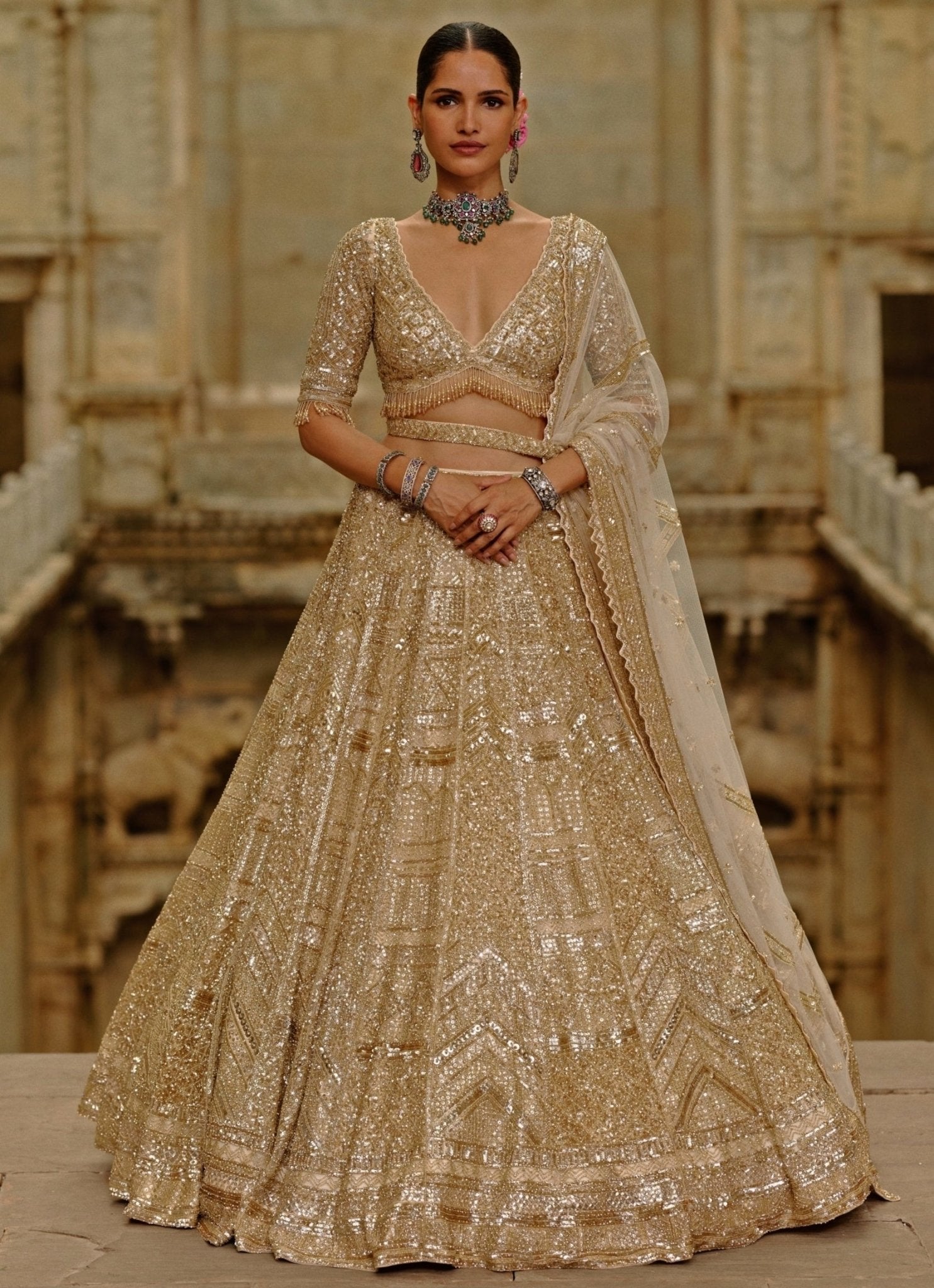 Embrace couture artistry for your once-in-a-lifetime moment in this Gold Bridal Lehenga Set. The lehenga is beautifully embellished with crystals, sequins, and cutdana work, offering radiant texture, while the blouse enhances its glamorous appeal. Completed with a matching dupatta and an optional veil, this look is ideal for evening wedding celebrations.