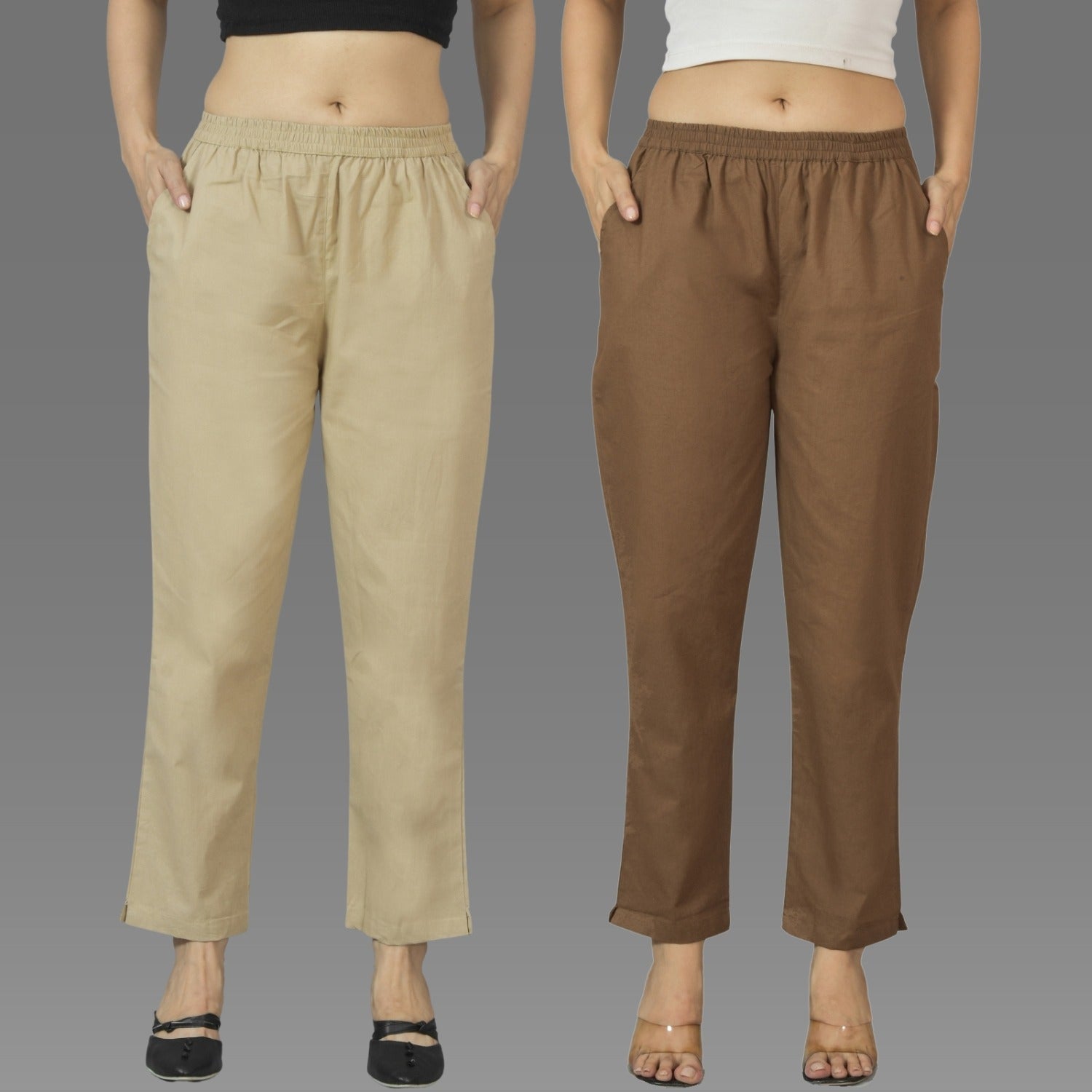Pack Of 2 Womens Beige And Brown Deep Pocket Fully Elastic Cotton Trouser