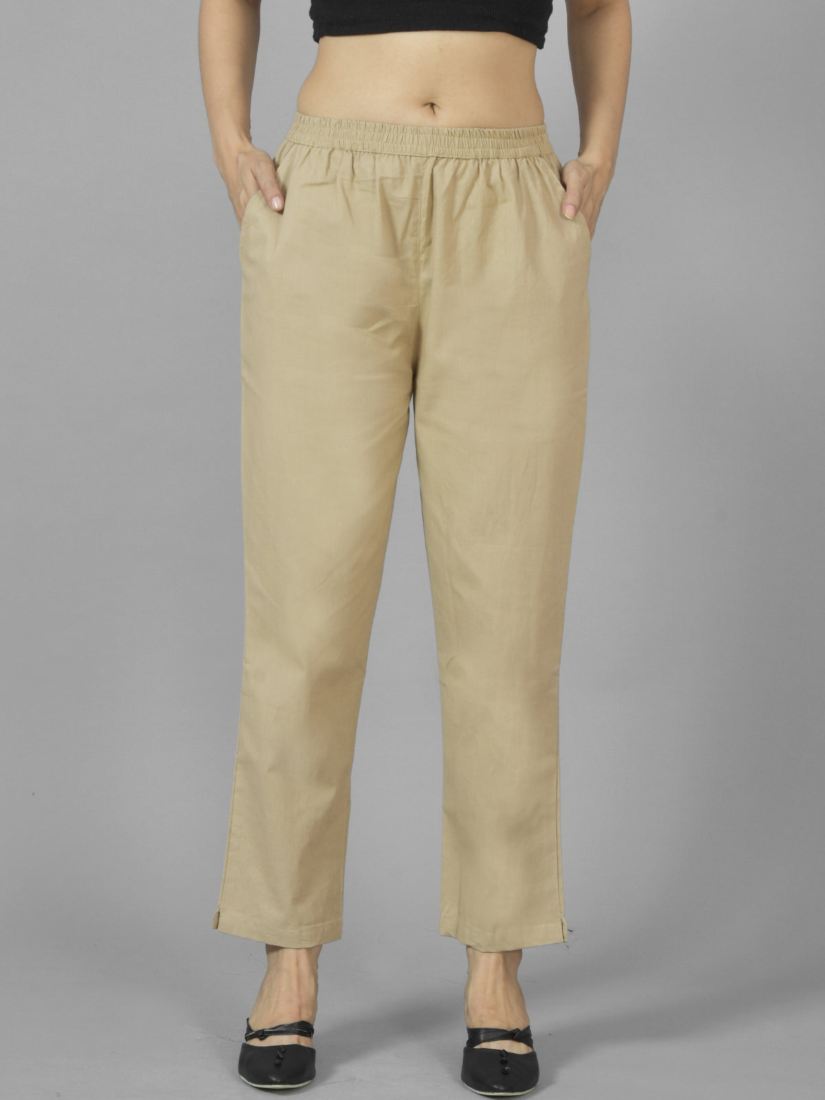Pack Of 2 Womens Beige And White Deep Pocket Fully Elastic Cotton Trouser