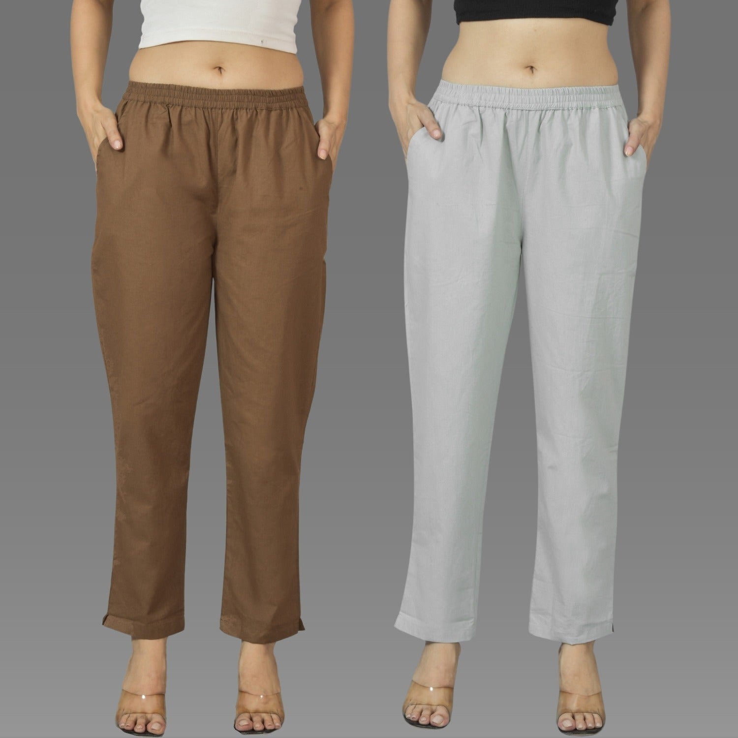 Pack Of 2 Womens Brown And Melange Grey Deep Pocket Fully Elastic Cotton Trouser