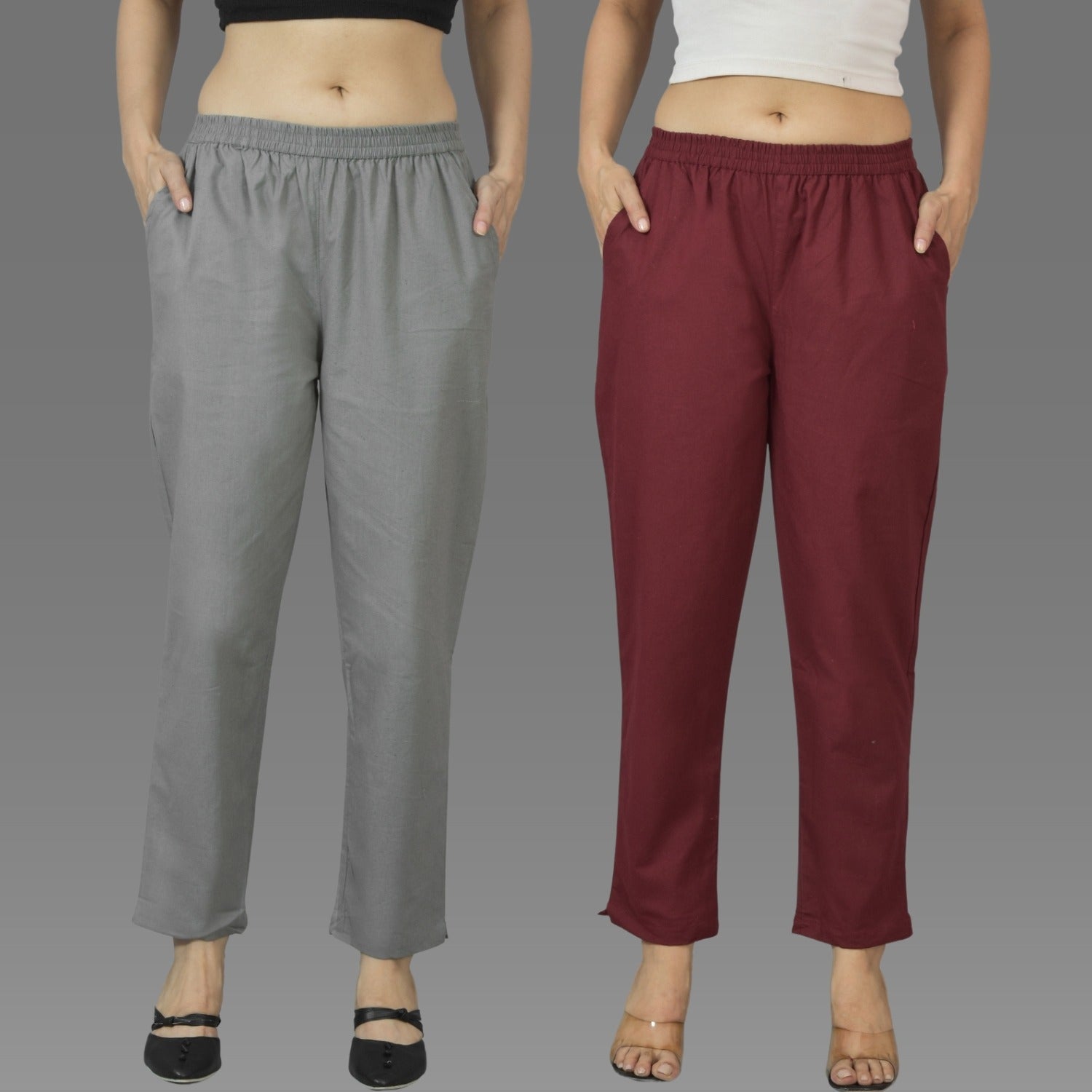 Pack Of 2 Womens Grey And Wine Deep Pocket Fully Elastic Cotton Trouser – Little Wish Fashion Collection