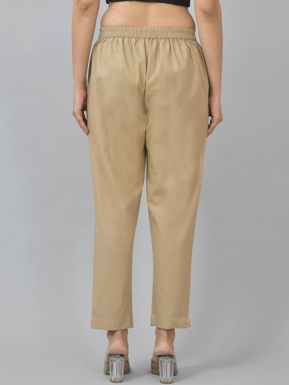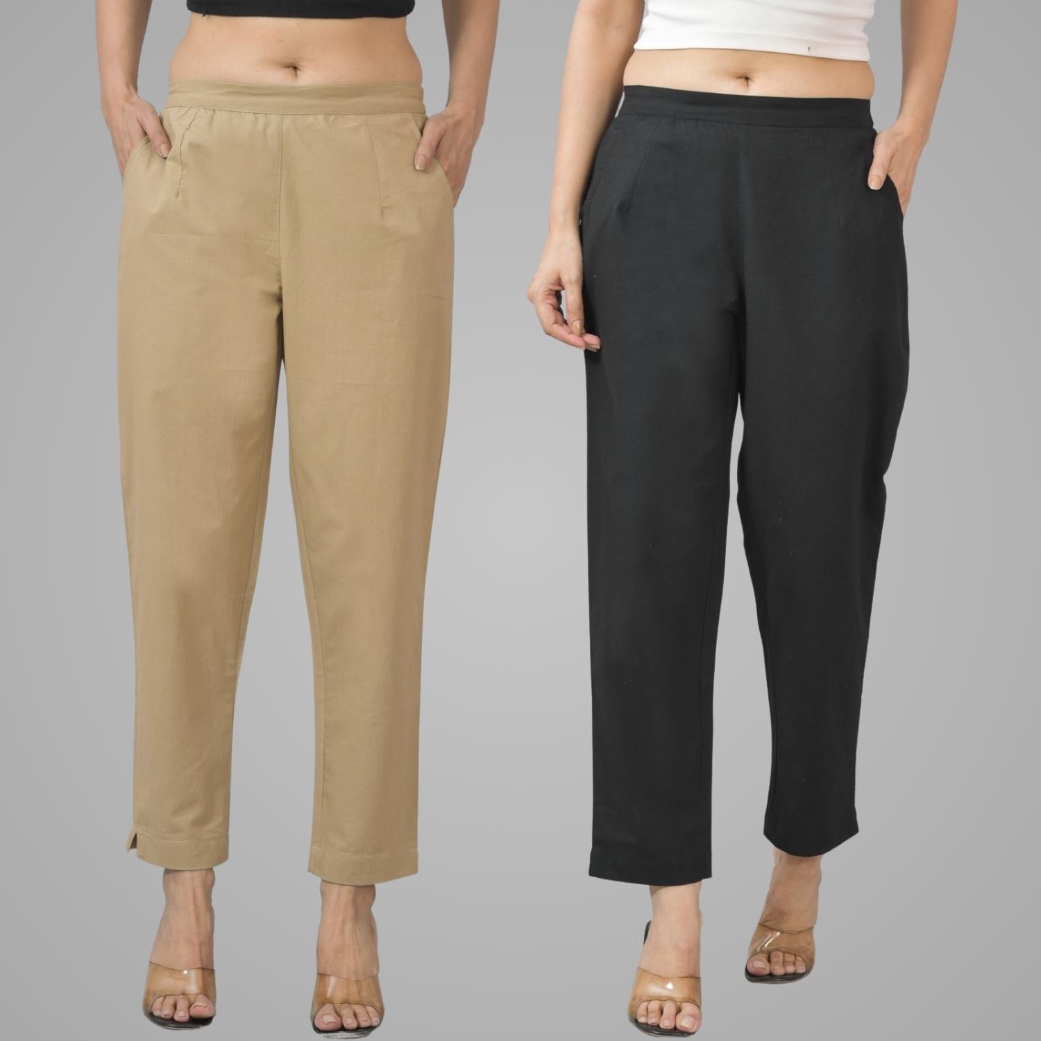 Pack Of 2 Womens Half Elastic Beige And Black Deep Pocket Cotton Pants