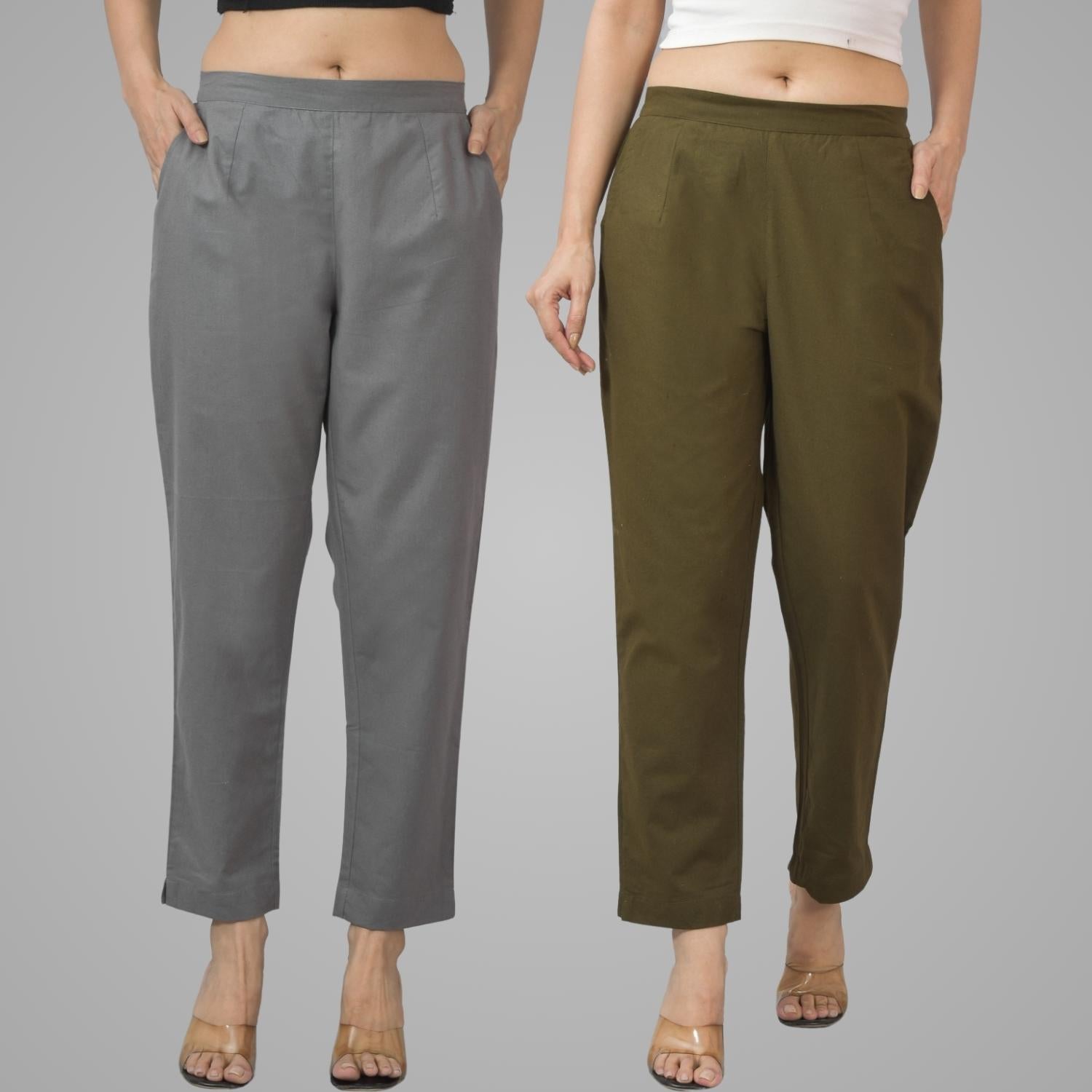 Pack Of 2 Womens Half Elastic Grey And Mehndi Green Deep Pocket Cotton Pants – Little Wish Fashion Collection