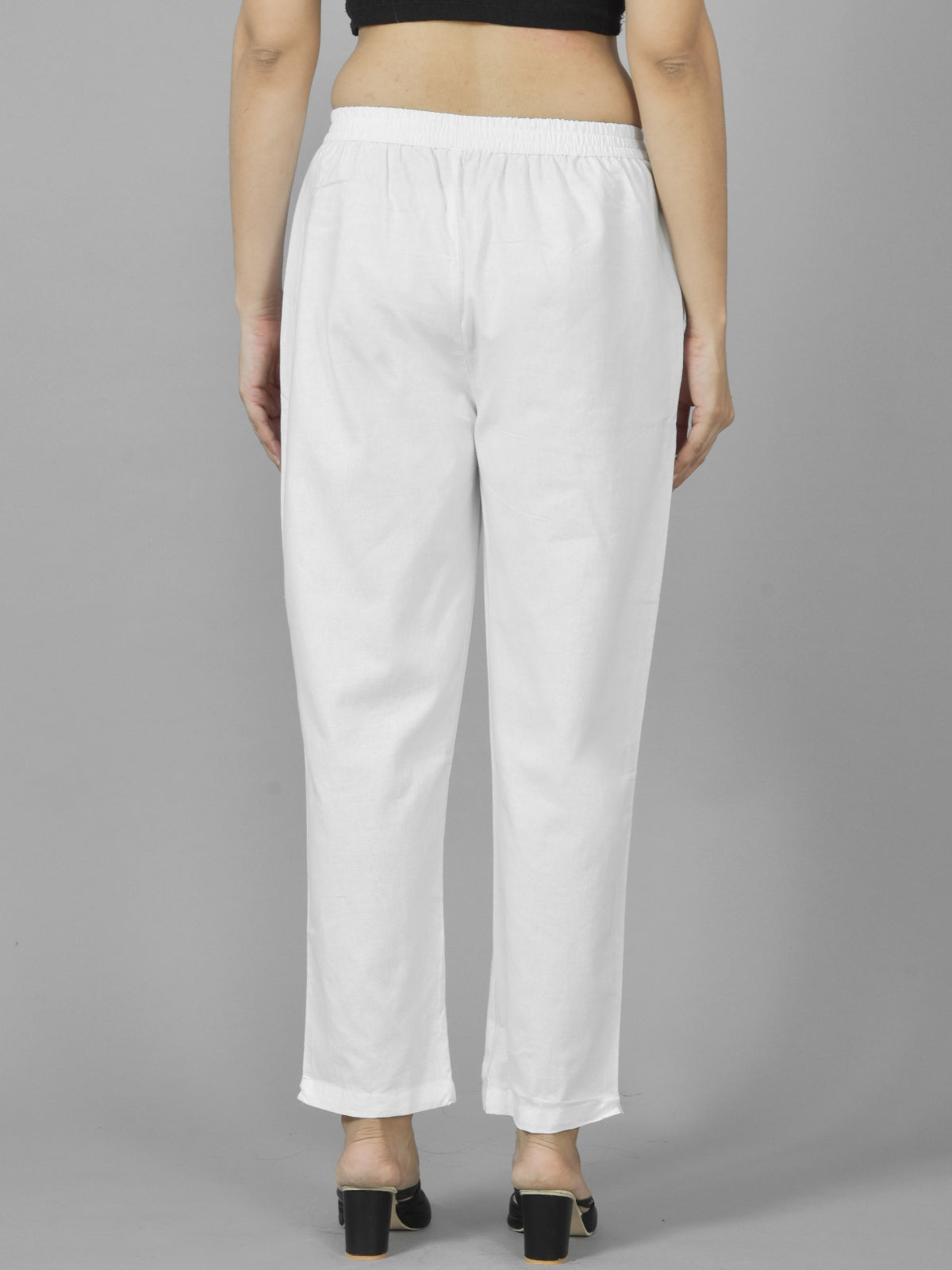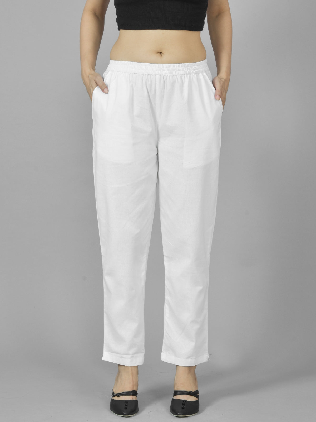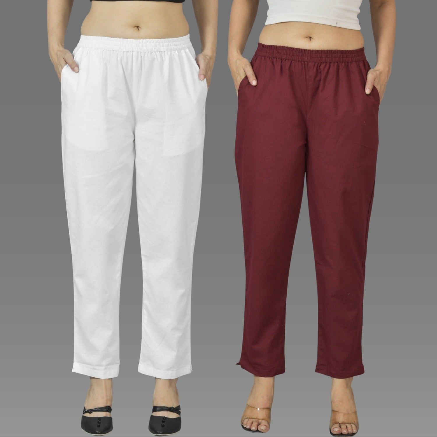 Pack Of 2 Womens White And Wine Deep Pocket Fully Elastic Cotton Trouser