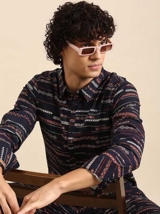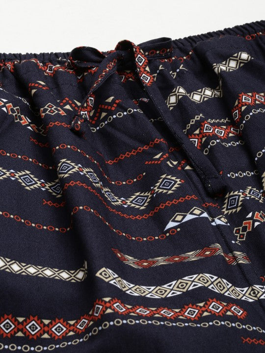 Product Details?Navy blue and orange printed co-ordsShirtNavy blue and orange printed shirtSpread collarRegular cuffed sleevesButton closurePyjamaNavy blue and orange printed pyjamaTwo side pocketsDrawstring closure