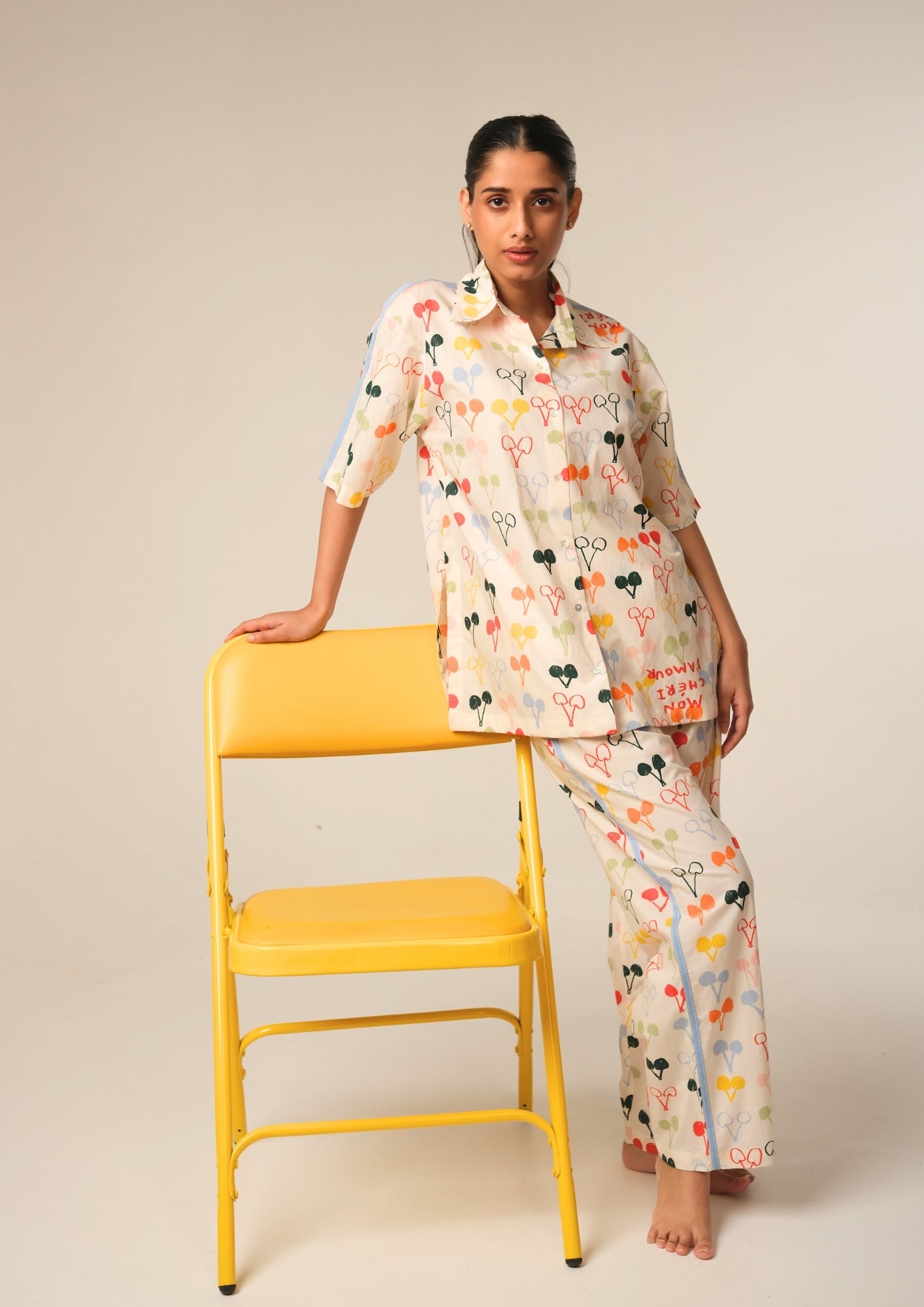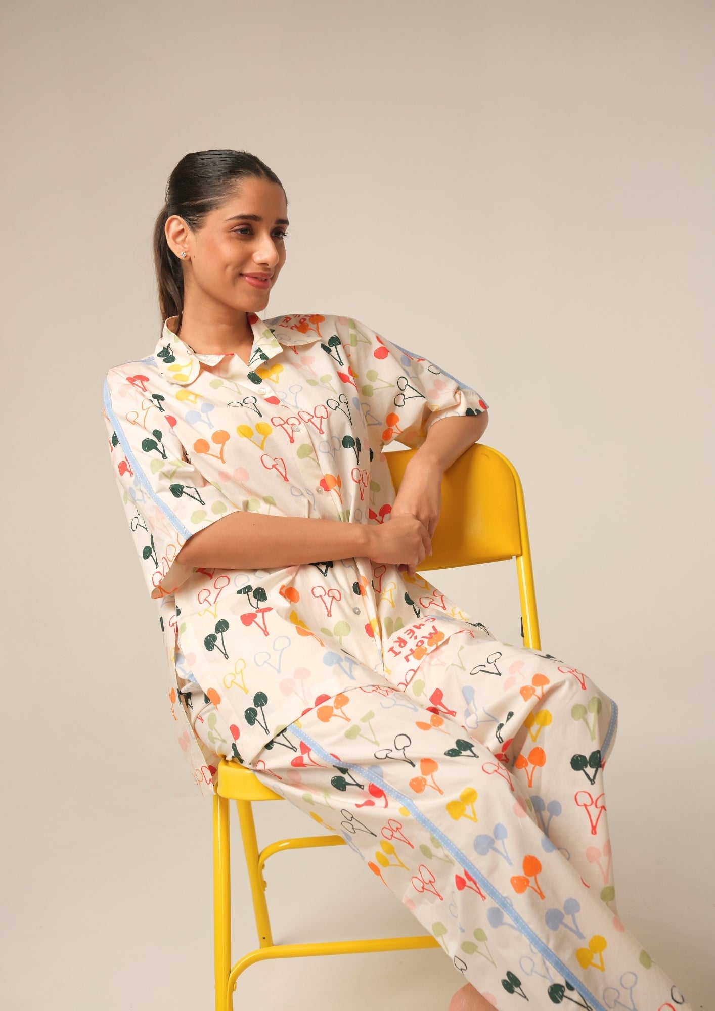 Infuse your nights with color and comfort in the Playful Cherry Print Cotton Night Suit ? a cheerful blend of style and coziness made for carefree lounging. Adorned with fun, vibrant multicolor prints, this set adds a lively touch to your nightwear while keeping you comfortable all night long.