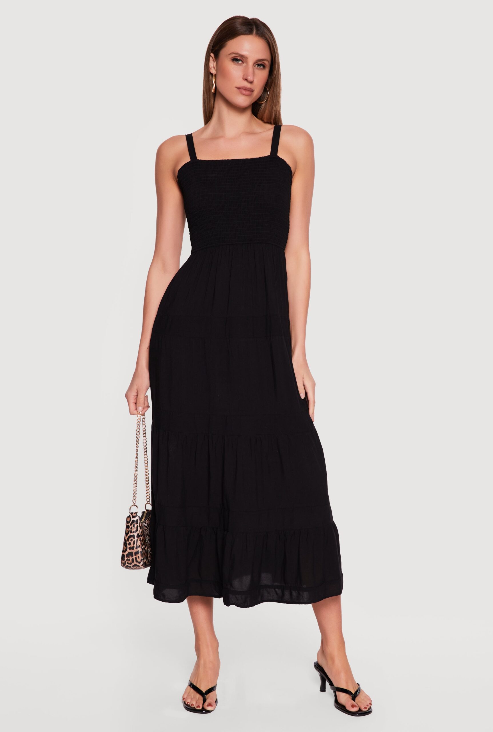 This midi dress features a classic fit with a square neckline and sleeveless design, creating a timeless silhouette. Its tiered construction adds subtle volume and movement, perfect for casual occasions. Adjustable straps enhance the fit, making it an easy-to-wear sundress for everyday style.