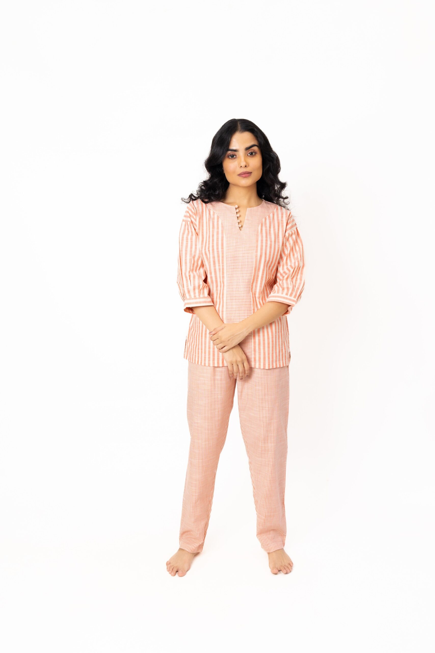 Elevate your loungewear game with this striped cotton night suit ? a two-piece set designed for effortless comfort and everyday elegance. Made from 100% breathable cotton, it offers softness, ease, and timeless style.