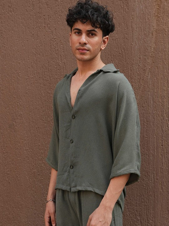 This co-ords consists of a shirt and trousersOlive textured shirt, has a shirt collar neck and three-quarter sleeves, secured with button closureOlive textured trousers, has an elasticated waistband with slip-on closure has 2 pockets