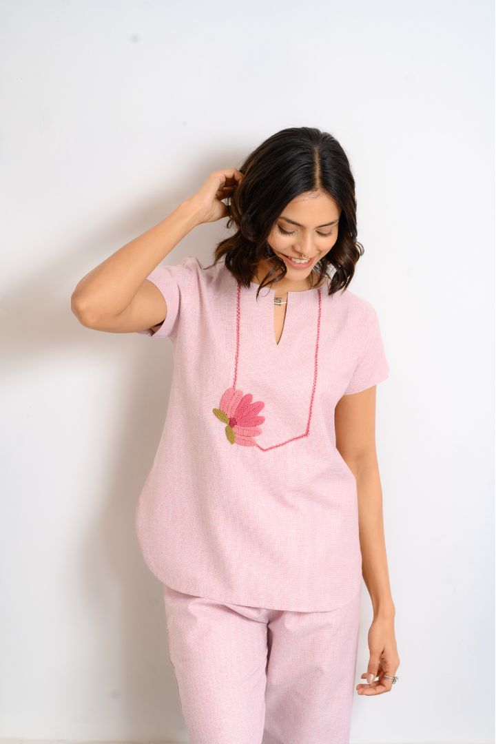 Unwind in sophisticated comfort with this Cotton Pajama Set, crafted for peaceful nights and effortless lounging. Featuring a hand-embroidered lotus motif and soft, breathable fabric, it blends delicate artistry with everyday ease.