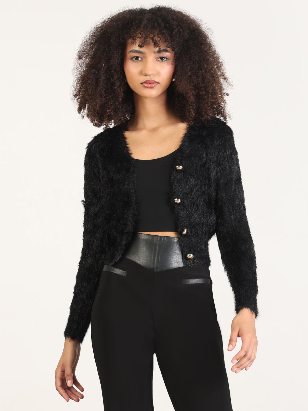 Designed in a classic black shade, this shrug pairs well with any ensemble.