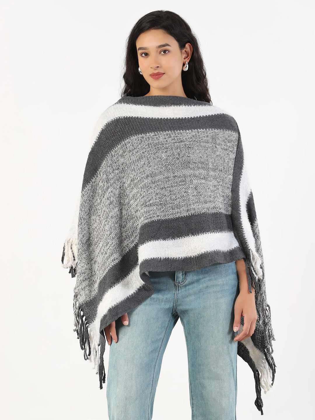 Elevate your wardrobe with our Women’s V-Neck Striped Grey Poncho, a perfect blend of style and comfort. Made from high-quality acrylic, this casual knitted poncho features a trendy striped design and fringed edges, making it an ideal choice for winter wear. Whether you’re heading out for a coffee date or a cozy night in, this versatile piece will keep you warm and fashionable.